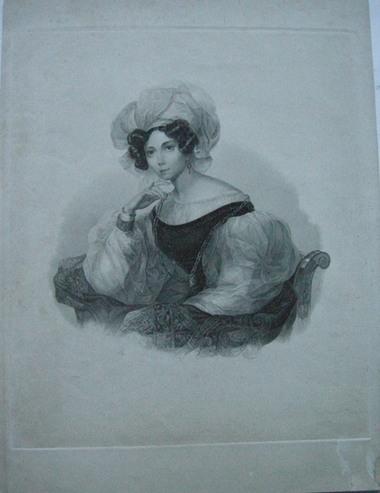 Portrait Zinaida Aleksandrovna Volkonskaya. _. Portrait in Halbfigur sitzend, eine Hand am Knie. Orig. Stahlstich von K. Buchov nach F. I. Razumikhin, um 1820, Abzug noch vor der Schrift. 23 x 23 cm, Blattgröße 42 x 31 cm. Sinaida Volkonskaya (1792 Dresden - 1862 Rom) Schriftstellerin, Dichterin, Sängerin und Komponistin wurde in Rom als Tochter des Tochter des russischen Botschafters Prinz Alexander Beloselsky-Belozersky geboren. Zunächst Hofdame der Königin von Preußen, übersiedelte sie 1817 nach Russland, ab 1822 führte die "Corinna des Nordens" einen musikalisch-literarischen Salon in Moskau. Nachdem sie nach den Aufständen der Dekabristen selbst in Verdacht geriet ging sie nach Rom wo sie ebenfalls einen Salon unterhielt.