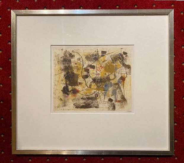 'o. T.' : gedämpft farbige Komposition : unten links signiert und datiert '61 : Ravensburg, 1961. Mischtechnik, Holzdruck und Gouache, Baltt 21 x 26 cm, frei im Passepartout [Lit.: Vollmer, IV, 333.- Broschüre der Springer Galerie Rot an der Rot im Oberen Tor, 2016].-. in hochwertiger Silberleiste wohnfertig gerahmt 48 x 53 cm, aufgewachsen in Bad Buchau studierte Springer 1924-29 an der Ulmer Kunstschule.- ab 1935 Atelier in Ravensburg.- 1964 Umzug nach Erlenmoos.- Springer nutzte verschiedene künstlerische Techniken; zu seinen Werken gehören unter anderem Ölgemälde, Aquarelle, Zeichnungen, Holzschnitte, Monotypien, Sgraffitoarbeiten und Glasfenster. Häufig griff er in ihnen religiöse Themen auf oder stellte Szenen aus seiner Heimat dar.-.