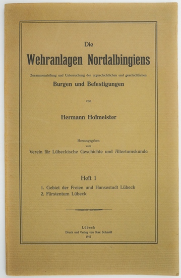 Die Wehranlagen Nordalbingiens. Zusammenstellung und Untersuchung der urgeschichtlichen und geschichtlichen Burgen und Befestigungen. - [Lübeck]. - Lübeck:, Max Schmidt, 1917. 1 Bl. (dreifarbige Übersichtskarte 1:300.000), 2 Bll., 81 Seiten, 13 Tafeln (teils mehrfarbig, teils gefaltet), 10 Bll. Pläne (meist farbig, meist gefaltet, teils mehfach gefaltet. Plan 10 lose beiliegend - so erschienen), OKart.,37 x 23,5 cm. Erster Teil der "Wehranlagen Nordalbingiens". - Enthält die Kapitel: "Gebiet der Freien und Hansestadt Lübeck" und "Fürstentum Lübeck". - Mit allen 24 Tafeln und Plänen (Frontispiz, 13 weitere Tafeln, 10 Pläne; meist mehrfarbig, meist gefaltet). - Enthält auch den Plan 10 ("Die Landwehr um Lübeck"), der vielen Exemplaren fehlt, da sie "zufolge der damaligen Kriegsverordnungen zu drucken verboten war" (beiliegende Verlagswerbung für den hier nicht vorliegenden zweiten Teil, der Ratzeburg und Lauenburg behandelt). Der Plan wurde verlagsseitig nachgeliefert und liegt deshalb lose bei. - Der Umschlag minimal angerändert; teils mit der Andeutung randlicher Bräunung; gutes Exemplar.