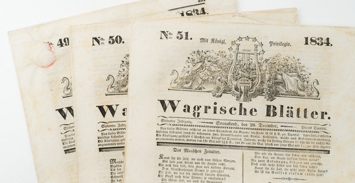Wagrische Blätter. - [1834]. - Oldenburg, Holstein:, Fränckel, 1834. 3 Ausgaben in losen Lagen: Seiten 391-412, 29,5 x 19,5 cm. Konvolut von 3 Ausgaben des Jahrgangs 1834 (Nummern 49 bis 51). - (= Wagrische Blätter, Siebenter Jahrgang). - Die in Oldenburg/Holstein erschienene Zeitschrift ist in den Bibliotheken von KVK und World Cat nur über ein Einzelheft der British Library, London, nachweisbar (Heft 14, 1833). Nicht in der ZDB nachweisbar. - Etwas fleckig; etwas angerändert; mittig gefalzt; ordentliche Exemplare.