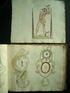 der zweiten Hälfte des 18 Jahrhunderts. 64 (7 lose beiliegend) Blatt Büttenpapier mit unvollständigem Wasserzeichen. Querformat: ca. 17,5 x 22 cm. Reste eines Halbpergamentbandes d. Zt. (Rückendeckel mit Modelpapierbezug; Vorderdeckel fehlt). Der Band enthält u.a. ca. 13 Seiten mit teilw. farbigen Bleistift- oder Tuschfederzeichnungen zu Schlössern u. Tür- oder Möbelbeschlägen, dazu 8 S. Handschrift in Tusche "Drittes Heft, welches von Thüren-Beschlägen enthält, nebst einer kurzen Anweisung wie sie bearbeitet werden sollen." (Enthält die Beschreibung der Darstellungen von vier "Platten", also wohl Tafeln eines Buches). - Weiter von Interesse sind ebenfalls teilw. farbige Skizzen zur Mythologie (9; darunter Theseus, Hermes, Themis, Hephaistos), teilw. lavierte Skizzen mit Ornamentik sowie auf 3 Seiten die Buchstaben K bis Z eines Alphabetes in Schreibmeistermanier (rot u. grüne Tusche). Außerdem viele kleinere, teilweise auch schwach ausgeführte Bleistift- u. andere Skizzen. - Starke Gebrauchsspuren.