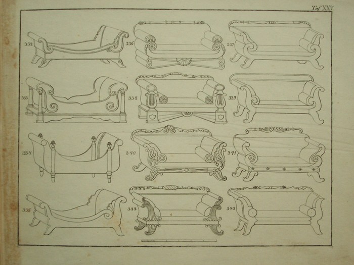 Mit über 600 Darstellungen sehr umfangreiches Musterbuch des zwischen Mitte der 20er Jahre bis Mitte der 60er in Berlin wohnhaften Malers, Zeichners u. Architekten G. J. Lipp. Die ersten 6 Tafeln ausschließlich mit Treppenbauten, anschließend die weiteren Bautischlerarbeiten. Teil 2 ausschließlich mit schematischen Darstellungen von Möbeln der Biedermeierzeit, darunter auch Quer- u. Längsschnitte, Grundrisse u. Details zur Konstruktion. Von besonderem Interesse sind die letzten drei Tafeln. Sie zeigen die Konstruktion des Unterhaltungsspieles "Colosseum" (eine Art Roulette), den Aufbau eines Billardtisches u. einer "Stoßbahn" sowie eine Holzschneidemaschine. - Angaben zu Lipp nach den Berliner Adressbüchern. - Eine weitere, im Umfang identische Ausgabe ist noch 1841 nachweisbar.