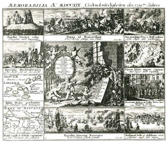 Denckwürdige Begebenheiten des 18ten Jahrhunderts nach Christi Geburt in Jährlichen Kupffer Blättern. Begleittext von Heinz Peters. Berlin, Lichtdruckerei Ganymed (um 1965). 4°. (12 S.) Begleitheft, 24 lose Lichtdrucktafeln auf Bütten, OKt.-Mappe mit goldgepr. Deckelillustration (die Mappe stellenw. verblaßt u. fleckig). Begleitheft etw. nachgedunkelt, mit kl. Eselsohr u. einem Kugelschreiberkringel. Die Tafeln sehr gut erhalten. * Eins von 150 numer. Exemplaren, gedruckt für die Freunde des Hauses.