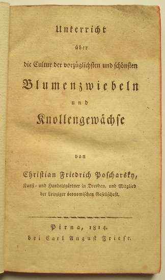 Einzige Ausgabe dieser umfangreichen Beschreibung von 53 Arten mit zahlreichen Unterarten. Der 1772 geborene Poscharsky war Kunst- und Handelsgärtner in Dresden, Mitglied der Leipziger oeconomischen Gesellschaft u. Verfasser weiterer zwischen 1808 u. 1832 erschienener Schriften. Er beschreibt u.a. Tulpen, Hyazinthen, Iris, Levkojen, Narzissen, Tuberosen, Lilien, Krokus u. Ranunkeln, die er auch alle "ablassen kann". Der Anhang in wesentlich kleinerer Schrift enthält das "Verzeichniss von Treib- und Glashaus-Pflanzen, so wie auch Staudengewächsen, die im Freien ausdauern, welche bei C. F. Poscharsky ... für das Jahr 1814 um beigesetzte Preise zu haben sind."