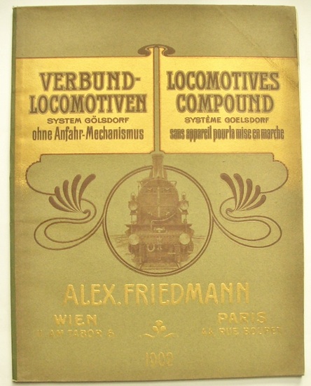 - Locomotives Compound avec dispositif système Goelsdorf pour démarrage sans appareils spéciaux. Mit montierter Lichtdruck-Tafel als Frontispiz u. 54 Abb. nach Photographien sowie 17 Abb. im Text. Wien u. Paris, Selbstverlag, 1902. 4to. (33,5 x 26,0 cm). 54 S. (ab S. 19 auch Tafel 1-36). Flexibler Orig.-Halbleinwandband mit Goldprägung.