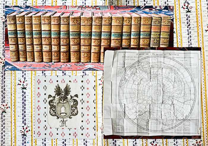 Paris, Hotel de Thou (vols. 22 and 23:) Laporte, 1780-, 1786. circa 20 x 13,5 cm., Together around 9000 pages with 51 often folding plates, 48 folding maps, 1 folding table. Contemporary polished calf with richly gilded spines, two labels, red fore-edges, decorated endpapers Brunet III, 771; Cox I, 33; Ebert 9296; Graesse IV, 79; Sabin 38632. First edition of this compilation of travel accounts following the collection "Histoire des voyages" of the Abbé Prevost. The pretty engravings (here numbered 38-82 and 1-6, marked "Benard direxit") show costumes, indigenous rituals, warfare or habits etc. With maps of China, Central Asia, Sibiria, Japan, the Caribbean, Mexico, South-Amerika, La Plata, Brazil, Louisiana, Virginia, New England, Hudson Bay, Quebec, Hispaniola, Martinique, Guadeloupe, Grenada, Jamaika, Barbados, Juan Fernandez, the Northern Sea, Spitzbergen, Iceland, Kamtshatka, Greenland, Tahiti etc. The folding table gives a comparison of the various polynesian dialects with the languages of other islands in the Pacific. - This set does not have the volumes 1-6 and 24-32 or the separate atlas. - Half-title and title of volume 9 with repairs. Only volume 8 with stronger waterstaining else just partly with light staining but mostly clean. Endpaper with engraved armorial bookplate, all plates with a very small and unobtrusive blind stamp with the arms of the family Haldenwang in the upper corner. Bindings mostly nice, only volume 8 with some lighter damage, else just somewhat rubbed or slightly bumped but mostly fine. The last two volumes a little different. A very decorative set of 17 volumes.