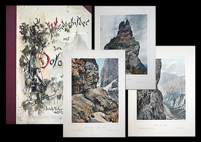 Stuttgart, Deutsche Verlags-Anstalt, 1894. circa 58 x 45 cm., Titel, 1 Blatt Widmung, 10 Seiten Text mit Abbildungen, 11 (statt 16) Tafeln, davon 4 in Farbe. Original-Halbleinenmappe mit farbiger Illustration auf dem Deckel vorne Sehr aufwendige, grossformatige Publikation mit eindrucksvollen Photos, die oft Bergsteiger auf den Felsen zeigen. Hier vorhanden in Farbe: An der kleinen Zinne - Auf dem Bande des Monte Cristallo - Der Gipfel der Croda da Lago - An den Felswänden der Croda da Lago. - In Monoton: Kletterer - An den Felswänden des Cimone della Pala - Monte Cristallo vom Schönleitenjoch - Cimone della Pala vom Gipfel der Rosetta - Ausblick von der Tofana im Winter - Misurinasee - Schluderbach im Winter - Es fehlen hier 5 Tafeln!.