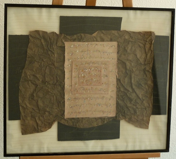Collage mit Malerei auf diversen Papieren. 1992. Bildgrösse: 62x71 cm. In der Mitte signiert und datiert. In Glasrahmen.