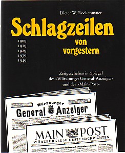Schlagzeilen von vorgestern. Zeitgeschehen im Spiegel des "Würzburger Generalanzeiger" und der "Main-Post". Würzburg, Mainpresse Richter Druck, 1979. 142 S. m. zahlr. s/w.-Fotos. 4° (25,1cm), Ln. m. OSchutzU. Zustand: Buch sehr gut. SU beschabt, mit Randläsuren und Druckstellen. - Hochinteressante Sammlung von Artikeln aus Vor- und Nachkriegszeit. Kurzweilig zu Lesen. - Das Buch basiert auf der gleichnamigen Sendereihe, die die "Welle Mainfranken" des Bayerischen Rundfunks während des Jahres 1979 ausgestrahlt hat. Beschrieben werden die Schlagzeilen der Jahre 1909, 1919, 1929, 1939 und 1949. - "Dieter W. Rockenmaier, 8.8.1933-27.1.2015 , war stellvertretender Chefredakteur der "Main-Post" und des "Schweinfurter Tagblatts". Er hat eine Reihe zeitgeschichtlicher Funksendungen verfaßt und schrieb die beiden lokalgeschichtlichen Bücher "Schlagzeilen von vorgestern" und "Schwarz auf Weiß"." (Verlagstext).