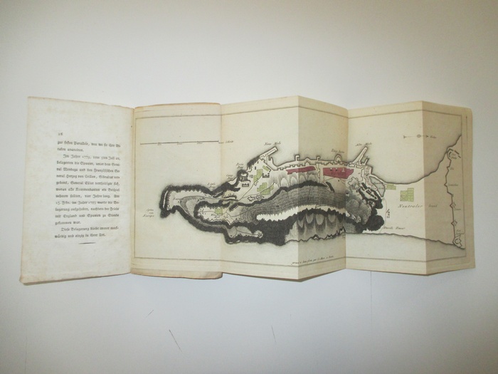 Beschreibung der Festung Gibraltar. Nebst einem Plan. Berlin, Braunes, 1808. 17,5 : 10,5 cm. 16 páginas con un plano plegado en colores. Cubiertas originales. Muy raro. - Descripción de la fortificación de Gibraltar. El plano mustra una vista detallada de Gibraltar hasta la frontera con España.