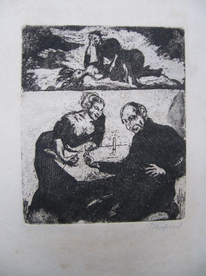 Original-Radierung. Motiv: zweigeteilt. Am Boden liegende Frau drückt Person weg; Mann und Frau am Tisch sitzend. signiert, wohl 1920er Jahre. S/W-Radierung ca. 15x12,5 cm auf Bütten (ca 30x23 cm). Das Büttenpapier stockfleckig und mit `Eselsohren` an zwei Ecken. Das Papier insgesamt nachgedunkelt. Unterhalb der Radierung vom Künstler mit Bleistift signiert. Ursprünglich wohl eine Buchillustration. Zum Künstler siehe auch: Ralf W. Müller - Künstlergruppe Chemnitz 1907-1933. <**UTFAQ**>Actually it is not possible, sending books to the USA. Aktuell können keine Bücher in die USA versandt werden.**UTFAQ**>.