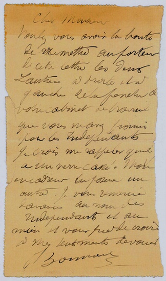 Autograph letter signed ("PBonnard"). N. p. o. d. 8vo. 1 p. To Paul Gallimard (1850-1929) asking to loan him "deux Lautrec à droite et à gauche de la fenetre de votre cabinet de travail". He notes that one has broken glass, and that he will have his own framer replace it. Bonnard thanks Gallimard on behalf of himself and "Les Independants". - Center fold, perforations torn somewhat hastily when the note was opened, with two short tears on the left edge, the right edge torn with loss of one or two letters, and perhaps a short word, slight toning at head, with holograph address on verso.