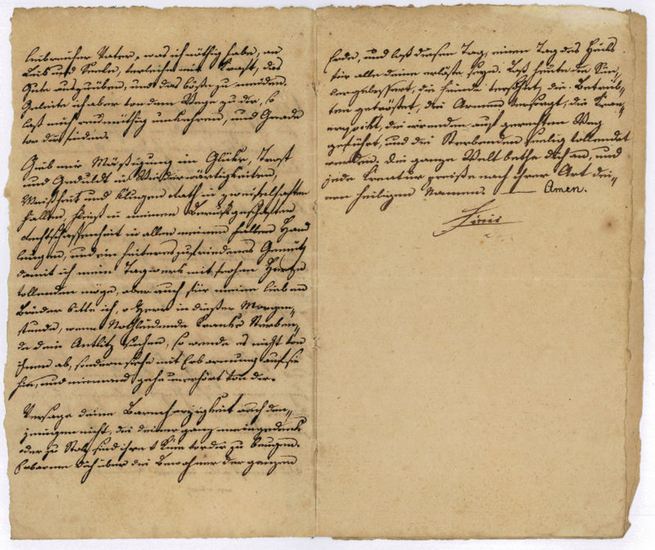 Eigenh. Manuskript (48 Zeilen). Janowitz in Böhmen, 1795. 2? SS. auf 3 Bll. 8vo. "Morgengebeth! || Allmächtiger Vater der Natur, in dieser Morgenstunde, wo Geschöpfe ohne Zahl die Herrlichkeit Deines heiligen Namens verkündigen, will auch ich in ihre Jubellieder einstimmen und Dich im Staube meiner Niedrigkeit anbeten [...]". - Etwas gebräunt.