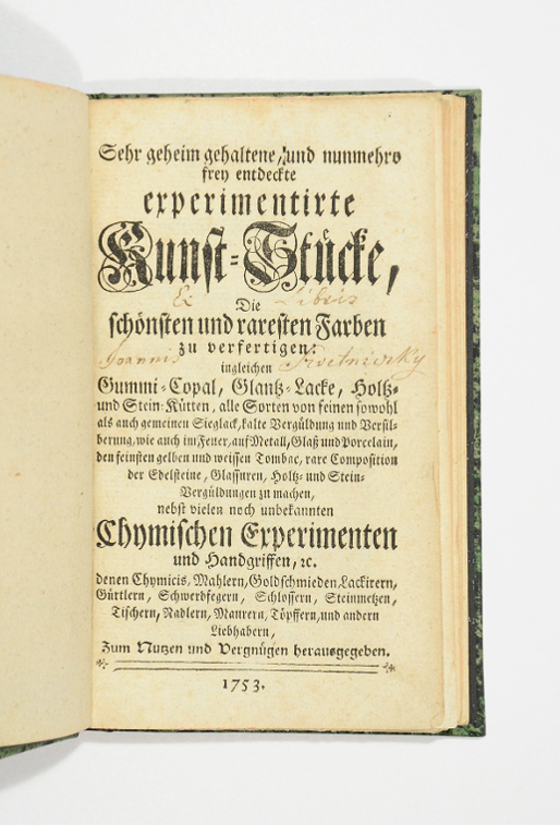 Sehr geheim gehaltene, und nunmehro frey entdeckte experimentirte Kunst-Stücke, Die schönsten und raresten Farben zu verfertigen: ingleichen Gummi-Copal, Glantz-Lacke, Holtz- und Stein-Kütten, alle Sorten von feinen sowohl als auch gemeinen Sieglack, kalte Vergüldung und Versilberung, wie auch im Feuer, auf Metall, Glaß und Porcelain, den feinsten gelben und weissen Tombae, rare Composition der Edelsteine, Glassuren, Holtz- und Stein-Vergüldungen zu machen, nebst vielen noch unbekannten Chymischen Experimenten und Handgriffen, etc. denen Chymicis, Mahlern, Goldschnieden, Lackirern, Gürtlern, Schwerdfegern, Schlossern, Steinmetzen, Tischlern, Nadlern, Maurern, Töpffern, und andern Liebhabern, Zum Nutzen und Vergnügen herausgegeben. Ohne Ort (Zittau), ohne Drucker, 1753. 8°. Mit einigen Holzschn.-Vignetten. 6 Bll., 148 S., Mod. marmor. Ppbd. Erstausgabe. - Der anonyme Verfasser (1707-86) war preußischer Bergdirektor, bedeutender Metallurg und Alchemist, trat aber auch als Rosenkreuzer hervor. - Etw. gebräunt u. stockfleckig. - Schießl 51; Bibl. Tinctoria 586; vgl. Ferguson I, 441f.; Ferchl 262; ADB XIV, 658f.; Wellcome III, 371; Schießl 1154.