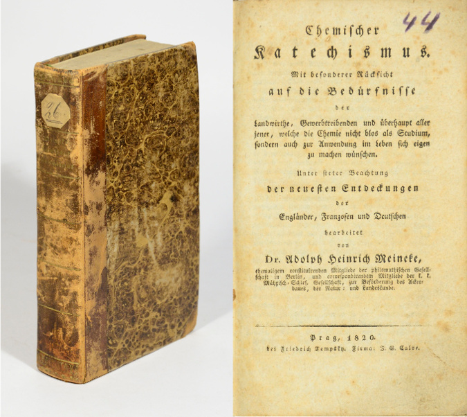 Chemischer Katechismus. Mit besonderer Rücksicht auf die Bedürfnisse der Landwirthe, Gewerbetreibenden [...]. Unter steter Beachtung der neuesten Entdeckungen der Engländer, Franzosen und Deutschen bearbeitet. Prag, bei Friedrich Tempsky. Firma: J. G. Calve, 1820. 8°. VIII, 653 (1) S., 1 Bl., Marmor. HLdr. d. Zt. m. etw. Rückenverg. u. goldgepr. Rückentitel. Erstausgabe dieses seltenen, in Frage- und Antwortform geschriebenen Werkes für die praktische Anwendung in der Landwirtschaft und im Gewerbe. Mit ausführlicher Behandlung der verschiedenen Säuren, der Pflanzen- und Tierbestandteile sowie der Metalle. Der Verfasser Adolph Heinrich Meineke (geb. 1762) war Arzt in Magdeburg und Berlin. - Einband berieben u. etw. bestoßen. Rücken m. kl. altem Nummernschildchen. Durchg. etw. gebräunt u. stockfleckig. - Poggendorff II, 103.