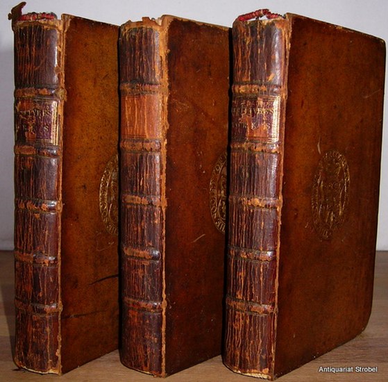 The works. With a new account of her life. 3 Bände. London, J. Knapton und andere, 1760-1761. XII, 376; 380; 372 S. Mit gestochenem Porträt (in Pagina). 8° (17,5 x 11 cm). Leder der Zeit mit Rückenschild. Erste Gesamtausgabe. - Centlivre (ca. 1669-1723) gilt als die erfolgreichste englische Dramatikerin des 18. Jahrhunderts. "The dramatic productions of this Lady are much admired, particularly her Busy Body, Wonder, and Bold Stroke for a Wife" (Lowndes). - Leicht gebräunt, stellenweise etwas fleckig, ein Blatt am Ende von Band III mit Randeinriß, die Vorsätze in den Rändern leimschattig. Einbände leicht bestoßen, die Kapitale etwas lädiert, die Rückenschilder mit Absplitterungen, das zu Band II fehlt. - Exemplar aus der schottischen "Signet Library", alle Deckel mit dem goldgeprägten Signet, die vorderen Innendeckel mit Signaturschildchen und gestochenem Exlibris. *Lowndes 400.