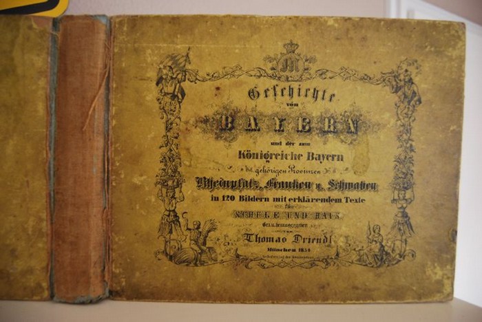 Geschichte von Bayern und der zum Königreiche Bayern gehörigen Provinzen Rheinpfalz, Franken und Schwaben in 120 Bildern mit erklärendem Texte für Schule und Haus. München, Driendl, 1854. VIII, 294 S. mit 118 Tafeln (es werden wohl das Frontinspiz und der illustrierte Titel mit zu den Tafeln gerechnet. Nach Zählung und Inhalt fehlt keine Tafel. 22 x 28 cm, Pappband. Fehlender Rücken später mit Leinenstreifen verstärkt. Bindung durchgehend gelockert und teilweise lose. Durchgehend fleckig. Ränder mit Einrissen und angeschmutzt. Gutes Leseexemplar.