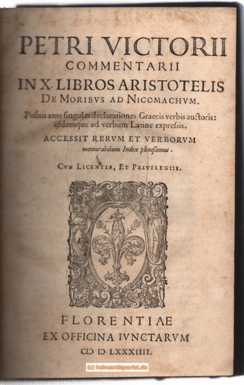 Petri Victorii Commentarii in X libros Aristotelis de moribus ad Nicomachum. Positis ante singulas declarationes Graecis verbis auctoris: iisdemque ad verbum Latine expressis. Accessit rerum et verborum memorabilium Index plenißimus. Cum Licentia, et Privilegiis. [Druckermarke (Z657)]. Florenz, Giunta, 1584. Florentiae Ex Officina Iunctarum M D LXXXIII (Florenz, Offizin der Giunta 1584). [Im Impressum genauer: Florentiae Ex Typographia Philippi, & Iacobi Iunctiae, & Fratrum [= Bernardo 1575 - 1586], M D LXXXIV.) [Letztes Blatt verso Druckermarke mit "Nil Candidius" und "F" (V70)]. 1 (weißes) Blatt; 6 Blätter (incl. Titel); 616 S; 1 Blatt (Errata); 19 Blätter (Indices und Impressum); 1 Blatt (Druckermarke); 1 (weißes) Blatt. Späterer Kalbslederband über sechs Bünden mit reicher Rückenvergoldung, dezenter Filetenvergoldung auf den Deckeln, sowie Kantenvergoldung. Allseitiger Rotschnitt. Marmorierte Innendeckel und fliegende Vor- bzw. Nachsätze. (31 x 21 cm) 4°. Hoffmann I, 291. Schweiger I, 52. Ebert 1149. Graesse I, 212. OCLC 759740657. Edit16 CNCE 29111 ("Var. B: Sul front. marca Z657 in luogo di U394"). - Berühmter Kommentar zur Nikomachischen Ethik des Aristoteles, die Summe eines Gelehrtenlebens, veröffentlicht mit 86 Jahren - Der spätere, wohl englische Einband des 18. Jahrhunderts ist restaurierungsbedürftig. Die Außengelenke sind angebrochen, am oberen und unteren Rücken kleinere Fehlstellen, die Kanten bestoßen, die Deckel berieben, der hintere stärker. Stellenweise etwas Lederverlust. Je ein Exlibris auf den beiden Innendeckeln, das vordere jünger und von "Robert Jay Hayhurst", das hintere älter und von "William Adair Esq." (vergl. unsere ausführlichen Anmerkungen). Die einzelnen Blätter unterschiedlich erhalten, von sauber bis minimal stockfleckig, von leicht bis stärker gebräunt, lagenweise, je nach der verwendeten Papierqualität. In der Mitte im oberen Bundsteg, kaum störend, eine alte Wurmspur. Große Druckermarke der Giunta (vergl. unsere Anmerkungen) auf dem Titelblatt recto, verso Holzschnitt-Portrait im Medaillon des Verfassers mit umlaufender Schrift: "Petrus Victorius Florentinus Annum Agens LXXXI". Das 81. Lebensjahr wurde von alter Hand korrigiert in "LXXXVI", also in sein tatsächliches Lebensalter von 86 Jahren. Mit zahlreichen Holzschnitt-Vignetten und historisierten Schmuckinitialen. Die Widmung des Verfassers an den Medici-Fürsten datiert auf den 24. September 1584 (Florentia VIII. K.[alendis] Octobr.[is] M D LXXXIII"). Die Zensurfreigabe im Impressum stammt bereits aus dem Jahre 1583. Kleiner Einriß im weißen Rand des Titelblattes hinterlegt. Die Druckermarke auf dem Titelblatt wird im Edit16 mit "Z657" ("Giglio fiorentino. In cornice figurata 1575 - 1600. Dimensioni: 7,5 x 10") bezeichnet und Bernardo, Filippo und Iacopo zugeordnet. Über dem Druckvermerk im Impressum eine weitere, vignettenartige Druckermarke mit zwei Putten und dem Motto "In Domino Confido" (A54 - V69 - Z651), die Druckermarke am Schluß identifiziert Edit 16 mit "V70". Nach Edit16 ist unser Exemplar eines der "Variante B", da die Druckermarke auf dem Titelblatt die der Giuntas (Z657) ist und nicht U394: "Stemma Medici-Capello (6 palle, leone, cappello). In cornice figurata". * Bitte fordern Sie bei Interesse unsere umfangreichen Anmerkungen an. * [Nicomachean ethics of Aristotle].