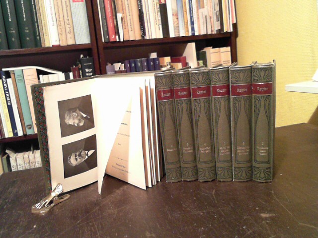 Reuters Werke. Im Vereine mit Conrad Borchling und Ernst Brandes herausgegeben von Wilhelm Seelmann. Kritisch durchgesehene und erläuterte Ausgabe. 7 Bände. Meyers Klassiker-Ausgaben. Leipzig Wien : Bibliographisches Institut, 1907. S. 436, 472, 460, 521, 469, 551, 534. 8° , grünes Leinen , Gute Exemplare mit Gebrauchsspuren. Aus dem Besitz von Prof. Hans Ulrich Bentzien 1934-1987 mit Originalrechnung von 1962. ; Bd. 1. Reuters Leben und Werke, Läuschen un Riemels, Bd. 2. Ut mine Stromtid. 1. und 2. Teil, Bd. 3. Ut mine Stromtid. 3. Teil, Ut de Franzosentid, Bd. 4. Schurr-Murr, Ut mineFestungstid, Bd. 5. De Reis` nah Belligen, Hanne Nüte un de lütte Pudel, Bd. 6. Dörchläuchting, De Reis` nah Konstantinopel, Bd. 7. Kein Hüdung, De Urgeschicht von Meckelnborg, Kleine Schriften.