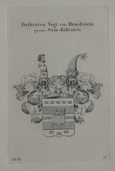 Kupferstich-Wappen von Tyroff. Freiherren Vogt von Hunoltstein genannt Stein-Kallenfels. Nürnberg, Tyroff, 1844. circa 21 x 13,5 cm (Blatt)., 1 Blatt. verso weiß Original-Kupferstichwappen aus dem Werk "Wappenbuch des gesammten Adels des Königreichs Bayern". - Kaum fleckig. Gut erhalten.
