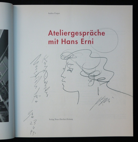 Ateliergespräche mit Hans Erni. Zürich, Verlag Neue Zürcher Zeitung, 1998. 23,5x22 cm. 157 S., 1 Bl. Mit s/w. Abb. OEngl.-Br. Titelblatt mit Original-Zeichnung, handschriflticher Widmung und Datum von Hans Erni. - (Einband leicht angestaubt).