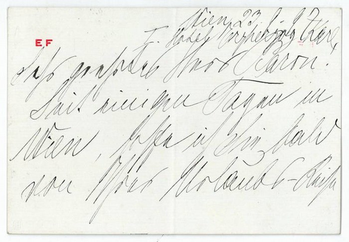 Eigenh. Brief mit U. wien, 23. II. 1897. 2 SS. Qu.-8vo. "Seit einigen Tagen in Wien, hoffe ich Sie bald von Ihrer Urlaubs-Reise zurückkehrend und werde mich dann sehr freuen, Sie wieder zu sehen [?]". - Gefaltet. Auf Briefkarte mit gepr. Initialen. - Nach einem Engagement am Stadttheater in Wien folgten Stationen in Koblenz, Nürnberg und am Deutsche Theater in Budapest, wo sie ihren Ehemann Hans Förster kennenlernte. 1889 zog sie sich von der Bühne zurück, erst nach dem frühen Tod ihres Mannes war sie wieder ab 1893 am Marienbader Sommertheater tätig. Ein Festengagement von 1893 bis 1895 am Dresdner Residenztheater folgte. 1897 gastierte sie am Theater in der Josefstadt, war in Hamburg und trat 1899 in den Verband des Stadttheaters in Brünn.
