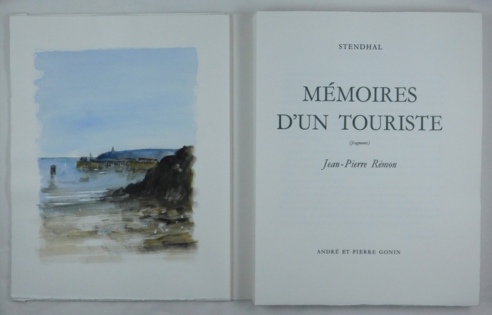 Mémoires d'un touriste (fragments) Lausanne, André et Pierre Gonin, 1973. 4°. 94 p.en feuilles avec 26 compositions dessinée et peintes à la main par Jean-Pierre Rémon. Broché sous chemise blanc avec impression du titre + couverture en d.-parchemin, étui bordé. Ex. IX de XII hors commerce sur Rives réservés à l'artiste, aux éditeurs et à leurs collaborateurs. Nominatif pour Ernest Abravanel, "qui a choisi les textes sans se permettre la moindre addition", après 12 sur japon et 38 sur Rives, signé par l'éditeur et l'artiste. Avec un envoi "Pour Ernest Abravanel grace à qui j'ai pu peindre ce livre que je suis si heureux de lui dédicacer aujourd'hui dans ce beau pays de Suisse où il fait bon peindre, vivre et réver..." Jean Pierre Rémon né à Paris en 1928, l?artiste peint dès l?âge de 14 ans. En 1947, sa rencontre avec Julien Green sera déterminante et révèlera sa vocation d?illustrateur. Il deviendra également l?auteur d?une quinzaine d?ouvrages. Inspiré par la montagne, Jean-Pierre Rémon est aussi peintre de la mer. Pierre Gaxotte de l?Académie française a dit de lui : « Un être rare parmi les grands ».