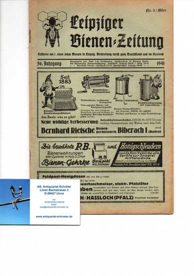 Leipziger Bienenzeitung. Ausgabe für Mecklenburg-Vorpommern. Nr. 3 / März. 56. Jahrgang. Leipzig, 1941. Seiten (1)39 - 57(10), ca DIN A5, Klammerheftung. Zahlreiche s/w-Abbildungen. Mehrere Seiten nur mit Werbeannoncen. Das Papier etwas stockfleckig, eine Ecke geknickt. Kleinere Randläsuren, das Papier zeitbedingt minderwertig. Selten. Rare. Good copy. Name mit Bleistift auf Deckblatt. Bei weiteren Wünschen zum Inhalt des Heftes setzen Sie sich bitte mit uns in Kontakt. <**UTFAQ**>Actually it is not possible, sending books to the USA. Aktuell können keine Bücher in die USA versandt werden.**UTFAQ**>.
