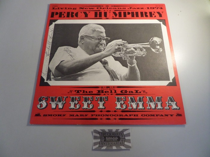Living New Orleans Jazz - 1974 [Vinyl, LP, SM 1974 P]. Smoky Mary Phonograph Company, 1974. 11 tracks. Vinyl. Mit Signaturen von Percy Humphrey (Trompete, Bandleader), Narvin Kimball (Banjo), Frank Dermond (Banjo), Willie Humphrey (Klarinette) und James Miller (Piano und Gesang) auf Cover!!!! Cover etw. berieben, LP sehr gut erh.!! Vereinzelt leichte Gebrauchsspuren.