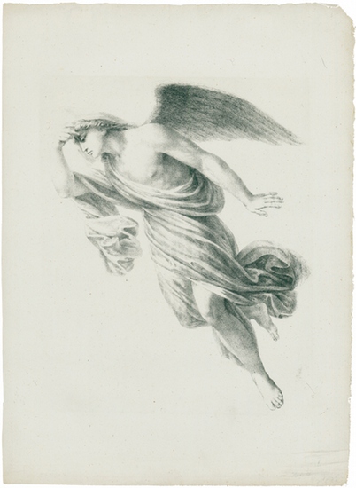 Ein mit der Rechten die Augen beschattender schwebender Engel aus dem ?Traum des Judas Ischariot?, nach der Messiade Fügers. 1825. Kreidelithographie 1825, auf cremefarbenem Bütten. 40,1:28,6 cm. Literatur: Giordani S. 30. Schon in seiner Gymnasialzeit in Linz trat die große zeichnerische Begabung Josef Hafners hervor, sodaß sein Vater, ein kleiner Beamter im Militärdienst, ihm ab 1816 ein Studium an der Wiener Kunstakademie ermöglichte. Unter Anleitung von Vincenz Georg Kininger erlernte er den Kupferstich und die Schabkunst und kam 1823 zum ersten Mal mit der lithographischen Technik in Berührung. Unter dem Eindruck der technisch und künstlerisch ausgereiften Kreidelithographien seines Lehrers Kininger schuf er in seinem letzten Akademiejahr 1825 eine Reihe von Lithographien nach diesem und Füger, die zeigen, wie er in kürzester Zeit diese Technik vollkommen zu beherrschen lernte. Nach Linz zurückgekehrt, erhielt er 1827 die Lizenz zur Einrichtung einer Steindruckerei, die nach ersten mühsamen Anfängen zur bedeutendsten in Oberösterreich aufstieg. Die Hafner-Offizin erlebte ihre Blütezeit in den Jahren 1832-1845, bis sie, unrentabel geworden, 1863 aufgelöst wurde. Hafner aber hatte sich bereits seit Mitte der 40er Jahre mit einem Steinmetzunternehmen und einem Bilderhandel eine zweite, einträgliche Existenz aufgebaut.