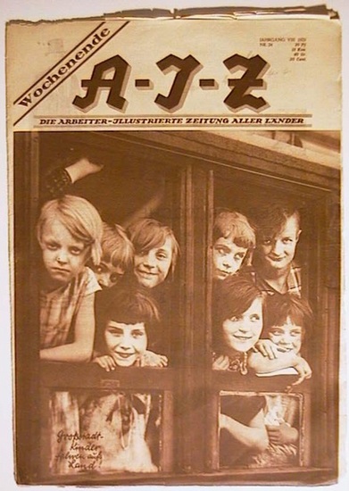 A-I-Z (Arbeiter-Illustrierte-Zeitung) Jahrgang VIII - Nr. 24- 1929. "Grosstadtkinder fahren aufs Land". Bln., Neuer Deutscher Verlag, 1929. 16 S., mit zahlreichen Abbildungen nach Fotografien. Illustrierter Original-Umschlag, 30 x 44 cm. Mit kleineren Einrissen. A-I-Z (Arbeiter-Illustrierte-Zeitung)