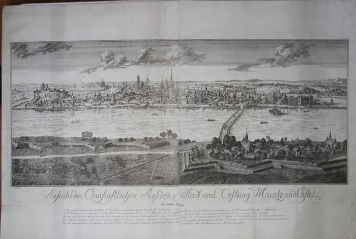 Mainz. "Ansicht der Churfürstlichen Residenz Stadt und Vestung Maintz und Castel im Jahr 1689". Sehr schöne Gesamtansicht über den Rhein als Panorama, von 2 Platten gedruckt. Kupferstich von Frey. 1689. Format (Darstellung): 27,8 x 63,5 cm. Plattenrand: 32,5 x 68 cm. Blattgröße: 45,5 x 68 cm. *"Vergrößerte, prächtige Ansicht nach M. Merian mit der 1661 gebauten späteren Schiffsbrücke" (Stopp). - Von zwei Platten gedruckte Panorama-Ansicht, unten mit gedruckter Bezeichnung und darunter mit 5-zeiliger Legende. - 3 vertikale Quetschfalten im Papier (schon beim Druck), mehrere restaurierte Einrisse im weißen Außenrand sowie 2 größere restaurierte Einrisse von links (ca. 10 bis 15 cm in die Darstellung reichend), diese von vorn mit dem bloßen Auge nicht sichtbar. - Eine sehr seltene großformatige Panorama-Ansicht, quasi eine 1689 gefertigte etwas vergrößerte Aktualisierung der Merian-Darstellung von 1633. Trotz der genannten Mängel noch ein akzeptables Exemplar in breitrandiger Erhaltung und von prächtigem Gesamteindruck.