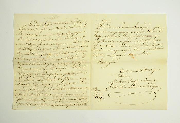 Eigenh. Brief m. Unterschrift. Rom, 1845. 3 S., 4°. ?[...] Der Junge wuchs in Wien auf und avancierte zum Kammerherrn des Kaisers [...]. 1805 sammelte Geramb zusammen mit dem bekannten Humanisten Graf Friedrich von Berchtold 65.000 Gulden an Spenden, für die von einer Hungersnot bedrohten Bewohner des Riesengebirges. Im gleichen Jahr stellte Ferdinand von Geramb in Wien ein Freikorps gegen Kaiser Napoleon I. auf und publizierte eine scharfe Proklamation gegen ihn [...]. 1809 kommandierte Geramb als Oberst ein österreichisches Regiment, das er auch in der Schlacht bei Wagram führte. 1810 schiffte er sich nach Cádiz ein, um in Spanien freiwillig gegen die Franzosen zu kämpfen. Er befehligte hier eine Guerillatruppe. Um für König Ferdinand VII. neuerlich ein antifranzösisches Freikorps aufzustellen, begab sich Geramb nach England zu seinem Bekannten Lord Francis Rawdon-Hastings, der ihm sehr gewogen war. Auch hier erließ er wieder Aufrufe gegen Napoleon. Die Anwerbung der Freiwilligen scheiterte jedoch, der Österreicher geriet in Schulden und verließ Großbritannien. Von dort per Schiff im damals dänischen Husum landend, wurde Geramb 1812 von den Franzosen gefangen und im Schloss Vincennes als politischer Staatsgefangener inhaftiert. Hier und im Pariser Gefängnis ?La Force? entwickelte sich eine Freundschaft zu seinem Mitgefangenen Étienne Antoine Boulogne, dem Bischof von Troyes. Unter dem Einfluss von Bischof Boulogne brach Ferdinand von Geramb mit seinem bisherigen Leben, gab das Soldatentum auf und trat 1815, nach seiner Befreiung durch die Alliierten, in den strengen Bußorden der Trappisten ein [...]. 1831 unternahm Frater Geramb eine Wallfahrt ins Hl. Land, worüber er eine Reisebeschreibung veröffentlichte. 1837 reiste er nach Rom und man erwählte ihn zum Titularabt bzw. Generalprokurator der Trappisten [...]. Papst Gregor XVI. wurde auf ihn aufmerksam und zog ihn in seine engere Umgebung. In dem Buch ?Reise von La Trappe nach Rom? schilderte der Mönch seine römische Zeit und zeichnet aus eigener Anschauung ein lebendiges Bild des Papstes. Er verfasste zudem zahlreiche spirituelle Werke [...]. Noch kurz vor seinem Tode sammelte Freiherr von Geramb große Summen für die nach dem schweizerischen Sonderbundskrieg von 1847 notleidenden Katholiken? (Wikipedia). - Der Empfänger des auf Französisch abgefassten Briefes ist Jacques (Jacob) Mislin (1807-1878). Der aus ärmlichen Verhältnissen stammende Mislin konnte dank seines Onkels an der berühmten Lehranstalt von Porrentruy im Schweizer Kanton Bern studieren, wo er nicht viel später auch selbst unterrichten sollte. Der 1830 zum Priester geweihte kath. Theologe wurde 1836 auf Vermittlung des Grafen von Bombelle an den Wiener Hof berufen, wo er einer der Lehrer der Söhne von Erzherzog Franz Karl und Erzherzogin Sophie wurde und damit sowohl den zukünftigen Kaiser Franz Joseph wie auch Erzherzog Ferdinand Maximilian (später Kaiser Max von Mexiko) unterrichtete (u.a. auch in Erdkunde). Vor der Revolution von 1848 unternahm Mislin eine Pilgerreise von Wien über Budapest und Konstantinopel nach Jersusalem. Der danach erschienene Reisebericht wurde in mehrere Sprachen übersetzt und mehrfach nachgedruckt. In den folgenden Jahren leitete er die Bibliothek am Hof der Herzogin von Parma, Erzherzogin Marie Louise, wurde zum Abt von St. Maria von Deg (Ungarn), geheimer Kämmerer u. Hausprälat Papst Pius' XI., Apostolischer Pronotar, Kanoniker der Kathedrale von Großwardein, Träger zahlr. Orden (u.a. von Spanien, Parma u. des Ritterordens vom Heiligen Grab zu Jerusalem) sowie Mitglied zahlr. Akademien. Der Verfasser zahlr. Publikationen und Vertraute des belgischen Königs und des Grafen von Chambord blieb nach der Rückkehr von seiner Pilgerreise in Wien, wo er weiterhin in persönlichem Kontakt mit dem Kaiserhaus stand. - In einem numerierten, von Mislin eigenh. beschrifteten Papierumschlag.