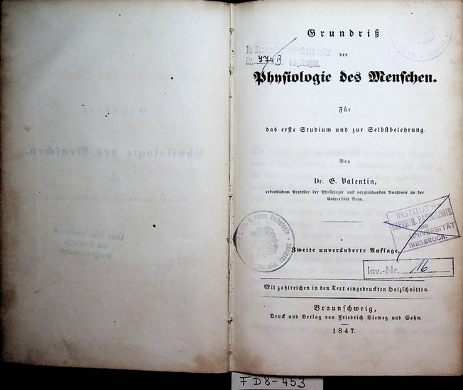 Grundri? der Physiologie des Menschen : F?r das erste Studium und zur Selbstbelehrung Braunschweig, Vieweg und Sohn Verlag, 1847. Zweite unver?nderte Auflage., Halblederband der Zeit, 8?, VI S., [1] Bl., 440 Seiten mit zahlreichen Holzschnitten im Text, Exemplar gestempelt, Text mit stellenweise mit zarten Bleisiftunterstreichungen, oberes Kapital etwas berieben, Seite 134 mit kl. Tintenfleck, insges. gutes Exemplar. Valentin, Gabriel Gustav Physiologe (1810 bis 1883) Erstausgabe erschien 1846 vgl. u.a. ADB Bd. 39, S. 463-464;.
