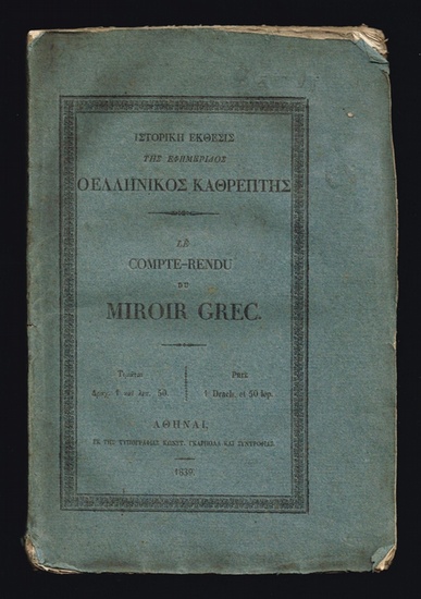 Le compte-rendu du miroir grec, Journal rédigé en grec et en français et publié à Nauplie, depuis le mois de mai 1832, jusqu'au mois de janvier 1833. Athènes, Constantin Garbolas et Compagnie, 1839. 8°. 80 p. Broché. Texte en grec et en français. - (Rousseurs). - Exemplaire non rogné. Literatur: Politics and Statecraft in the Kingdom of Greece, 1833-1843 (Google), Seite 115.