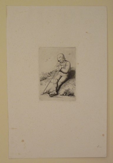Kupferstich. Schlafender Hirtenjunge in Lederhosen. _. Plattengrösse: 9,8x6,7 cm. Blattgrösse: 27,7x18 cm. Unter Passepartout (50,7x37,6 cm). Monogrammiert JV? - Ränder leicht fleckig. Blatt verso und Passepartout recto gestempelt: Landamann Dietrich Schindler. - Dietrich Schindler, 1795 geboren in Mollis, 1882 gestorben in Wiesbaden, genoss eine Ausbildung m Fellenberg Institut in Hofwil, absolvierte ein Rechtsstudium in Heidelberg, Bonn und Berlin und eine kaufmännische Lehre in Triest. 1821 wurde er Glarner Ratsherr, 1824 Pannervortrager, 1826 Zeugherr und 1834 Landesfähnrich, nach 1822 Mitglied des evangelischen Appellationsgerichts sowie 1834 und 1838 Tagsatzungsgesandter. Er förderte die Schulreform und erarbeitete eine Anleitung für Lehrer, setzte sich für den Ausbau des Strassenwesens ein, u.a. initiierte er die Kerenzerbergstrasse. Ab 1831 verfocht er liberale Postulate, 1832 befürwortete er die Revision der Bundesakte. Als Mitglied des kantonalen Verfassungsrats von 1836 war er massgeblich an der Ausarbeitung der Glarner Verfassung beteiligt, welche die Aufhebung der konfessionellen Landesteilung brachte. Insbesondere die Ausführungsgesetze stammten von ihm. Als Führer der Reformpartei 1837 zum Landammann gewählt, konnte er den Widerstand der Katholiken erst durch die militärische Besetzung von Näfels brechen. Von den Radikalen, die ihm Nachgiebigkeit gegenüber der katholischen Geistlichkeit vorwarfen, wurde er zunehmend angefeindet. 1840 liess er sich überreden, das Statthalteramt zu übernehmen. Ein Jahr später trat er von allen Ämtern zurück und übersiedelte 1842 nach Zürich. Schindler verhalf dem Liberalismus im Kanton Glarus zum Durchbruch. Er vertrat eine gemässigte Richtung, die den Ausgleich mit der kath. Minderheit suchte. (Veronika Feller-Vest, HLS).