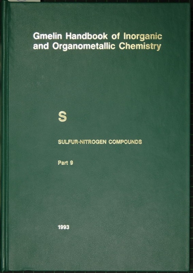 Gmelin Handbook of Inorganic and Organometallic Chemistry. (Handbuch der anorganischen Chemie). 8th edition. S Sulfur-Nitrogen Compounds, Part 9: Compounds with Sulfur of Oxidation Number II. By Norbert Baumann, Hans-Jürgen Fachmann a.o. Berlin, Springer, 1993. 25 x 17 cm. XXIV, 336 Seiten. Gebundene Ausgabe. *Stempel auf der Titelrückseite. Unbenutzte Bibliotheksdublette in neuwertigem Zustand. (Im Buchhandel vergriffen). ISBN 3540936645.