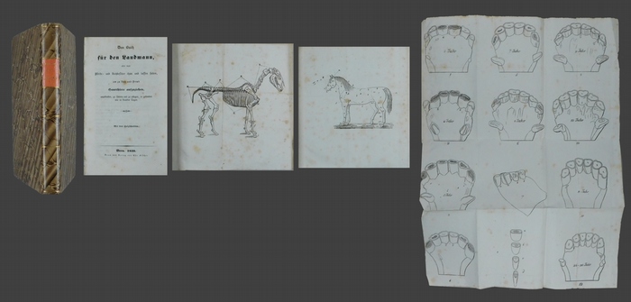 Das Buch für den Landmann, oder was Pferde- und Viehbesitzer thun und lassen sollen, um zu Nutz und Freud Hausthiere aufzuziehen, anzukaufen, zu füttern und zu pflegen, in gesunden wie in kranken Tagen. Bern., Druck und Verlag von Chr. Fischer., 1838. 8°. 2 Bl., 299 S., 1 S., 3 gefaltete Tafeln. Pappband der Zeit mit Rückenschild. Text stellenweise und alle 3 Tafeln stockfleckig.