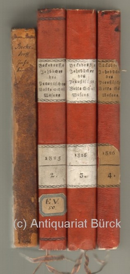 Jahrbücher des Preußischen Volks-Schul-Wesens. Hg. von Ludolph Beckedorff. 1.-4. Band (von 9). Mit graphischen und gefalteten tabellarischen Darstellungen. Berlin: T. Trautwein in Kommission, gedruckt bei Joh. Gottl. Brüschke. 1825-1826. Gr.-8°. (anfangs Signaturen und Stempel, sehr wenig beschabt, innen sehr wenig gebräunt, Bd. 2-4 breitrandige, unbeschnittene Exemplare). Enthält zahlreiche Darstellungen zur Geschichte und Entwicklung des preussischen Schulwesens, die einen detaillierten Einblick in die Zeit erlauben, auch zu Mädchenschulen und Lehrerinnenausbildung. U.a. mit folgenden Beiträgen: "Über den Begriff der Volksschule."; C.B. Schultz "Grundsätze und Plan des christlichen Religions-Unterrichts in Volksschulen."; "Die Preußischen Schullehrer Seminarien,"; "Circulare des K. Consistorii zu Münster den Gesang-Unterricht betreffend."; "Vorläufige Notiz über das Berlinische Schulwesen." Mit einer tabellarischen Übersicht zur Kinderarbeit!; "Volksschulwesen im Regierungs-Bezirke von Gumbinnen, hauptsächlich in Beziehung auf die vermehrte Zahl der schulfähigen Kinder und auf das Verhältnis der Einwohner deutscher, lithauischer und polnischer Zunge."; "Taubstumme, Taubstummen-Anstalten und Taubstummen-Unterricht."; "Mysticismus, Pietismus, Separatismus."; "Nachricht von Herr von Türk's Schrift: Ueber den Seidenbau nebst einer Anleitung zu dessen Betreibung."; "Ueber Simultan-Schulen." (= gemischt konfessionelle); "Jüdisches Schulwesen." - Ludolph von Beckedorff (1778-1858) wurde nach medizinischen und philosophischen Studien Prinzenerzieher und wuchs in eine romantisch-konservative Staatsanschauung hinein. Auf Grund seiner Kritik des bisherigen Schulwesens und des Süvernschen Unterrichtsgesetzentwurfs - statt "künstlicher Gleichheit der Volkserziehung" forderte er die "naturgemäße Ungleichheit der Standeserziehung" - wurde ihm 1821 die Leitung des Volksschulwesens übertragen. Hier erwarb er sich große Verdienste, besonders um die Lehrerseminare, auch durch Herausgabe der "Jahrbücher des Preußischen Volksschulwesens" (1825 bis 1828). 1827 konvertierte er bei Bischof J. M. Sailer zum Katholizismus und wurde daraufhin aus dem preußischen Staatsdienst entlassen. Beckedorff zog sich nun auf sein Gut Grünhof zurück, das er zu einem Mittelpunkt des norddeutschen Katholizismus ausbaute; zur Rechtfertigung seines Übertritts veröffentlichte er ein 4bändiges apologetisches Werk. Friedrich Wilhelm IV. hat ihn nach seinem Regierungsantritt rehabilitiert, geadelt und zum Präsidenten des Landesökonomiekollegiums ernannt. - Zusammenfassend zitiert nach NDB. Band 1 auf dem vorderen Spiegel mit dem Einkleber der Bibliothek der Stadtschullehrer: "Zur Büchersammlung der Schulgesellschaft in Stettin. (Gesetze der Lesegesellschaft.)". Weitere Bilder auf Anfrage oder auf unserer Homepage.