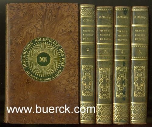 Vie de Saint Vincent de Paul, instituteur et premier supérieur de la congrégation de la mission et des filles de la charité. Nouvelle Édition. Fünf Bände (so komplett). [Text Französisch]. Lyon: Perisse Freres. 1836. (ganz gering berieben, innen nur sehr wenig braunfleckig, insgesamt sehr gut erhalten). Sehr reizvolle Schulpreiseinbände, auf Band 1 mit aufgelegtem rundem Ledermedaillon der Schule. Beiliegend vier Dedikationszettelchen (zwei Motive, jeweils doppelt vorhanden) der Schule in Gand (Gent), datiert 1839. Vinzenz von Paul (Pouy - heute: St. Paul de Vence 1581 - 1660 Paris) war Priester und gilt als der Begründer der neuzeitlichen "Caritas", er wurde 1737 heiliggesprochen. Louis Abelly (1603-1691) war ein Freund des Hl. Vinzenz. Die vorliegende Biographie richtet sich auch gegen Jansenius und den "Jansenismus".