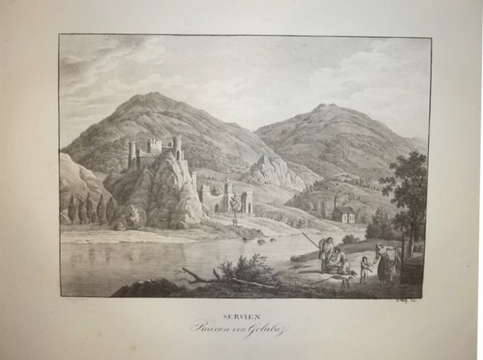 "Ruinen von Golubaz. Servien". Lithographie von Adolph von Kunike nach Ludwig Erminy und F. Wolf. Aus: Adolph Kunike: Zwey hundert vier und sechszig Donau-Ansichten. Wien, Kunike, 1826. Ca. 26 cm x 35 cm. Nebehay/W. 336, 194. - Schöne Ansicht des Donautales bei Golubatz an der serbisch-rumänischen Grenze mit Blick auf die Ruinen der Burg über die Donau. Im Vordergrund Figurenstaffage. - Breitrandiges Exemplar. - Ränder leicht fleckig.