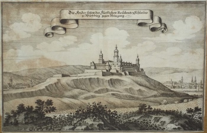 "Die Ander seiten des Fürstlichen Residentz Schlosses zu Würtzburg gegen Nidergang.". Kupferstich von Matthäus Merian. Aus: Topographia Franconiae.