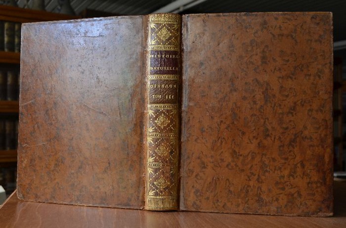 Histoire Naturelle des Oiseaux. Bd. 3 (apart). Paris, L`Imprimerie Royale, 1775. 10 Bll.; 502, XCVI S. mit 31 Kupferstichen in schwarz weiß 26 x 20 cm, geflammtes Leder mit 2 Rückenschilden, Rücken- und Stegrandvergoldung sowie umlaufendem Rotschnitt. Einband berieben und bestoßen. Exlibris (adeliges Allianzwappen) auf Innendeckel. Gelegentlich wenig fleckig. Insgesamt gute und frische Erhaltung.