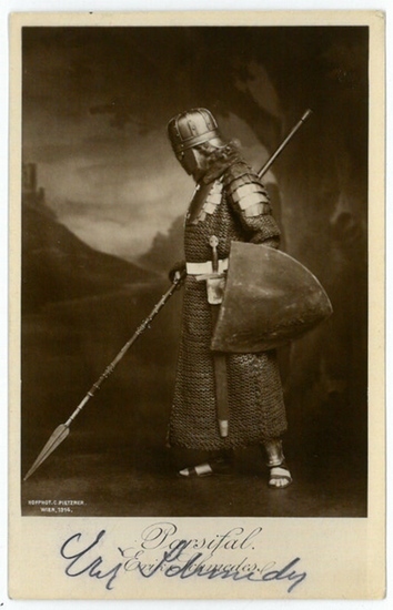 Portraitpostkarte mit eigenh. U. O. O. u. D. 1 S. 8vo. Hübsche ganzfigürliche Darstellung des Sängers im Rollenkostüm zu Wagners ?Parsifal?. - Schmedes debütierte 1891 als Bariton am Hoftheater in Wiesbaden in der Partie des Heerrufers im Lohengrin, sang dann am Stadttheater in Nürnberg und war nach Studien bei August Iffert in Dresden als Heldentenor an der Hofoper in Dresden tätig. 1898 kam er an die Wiener Hofoper und sollte ihr bis 1924 angehören. 1908 gab er in der Wiener Erstaufführung von d?Alberts "Tiefland" den Pedro, 1919 sang er die Titelrolle in Hans Pfitzners "Palestrina", wurde vor allem aber durch seine Wagner-Partien bekannt. Vgl. Öst. Lex. II, 352.
