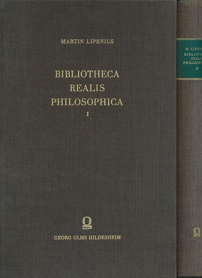 Bibliotheca realis philosophica. 2 Bände. Reprint der Ausgabe Ausg. Frankfurt a.M., Friderici, 1682. Hildesheim : Olms, 1967. 1593 S. plus Index. Originalleinen. Schnitt leicht angeschmutzt. - Berühmt wurde Martin Lipenius durch sein Lebenswerk, die Biblotheca realis. In vier Foliobänden legte er damit in den Jahren 1679?1685 umfassende Fachbibliografien der Fächer Jura, Medizin, Philosophie und Theologie vor. Geordnet waren diese Bände wie ein Realkatalog; Lipenius gliederte die von ihm erfassten Bücher nicht alphabetisch nach den Verfassernamen, sondern gemäß ihrem Inhalt nach einem System der Wissenschaften in eine Vielzahl von Disziplinen, Gruppen und Untergruppen. Die immense Arbeitsleistung, die in den Bänden steckt, war seinerzeit hoch geachtet, später jedoch wurde ihm vorgeworfen, die Bibliotheca realis strotze von groben und zum teil lächerlichen Fehlern und auch der vorsichtigste Gebrauch derselben ist schon gefährlich. Doch trotz der Mängel und Tücken dieses Werkes gilt es in manchen Bereichen als unentbehrlich und wird bis in die Gegenwart benutzt; für den juristischen Teil erschienen bis ins frühe 19. Jahrhundert mehrere Bände Ergänzungen und Berichtigungen.