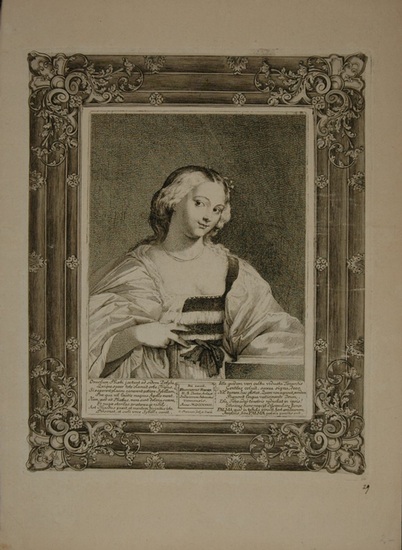 Phoebe. Darstellung der Phoebe, Inhaberin des Orakels von Delphi in Habfigur, unten mit lateinischem Text, umgeben von dekorativem Zierrahmen und floraler Verzierung. Bildnis und Umrahmung von 2 Platten gestochen. Wien, 1733. Format Bildnis: ca. 23 x 17 cm. Format Zierrahmen: 32 x 26 cm. Blattgröße: 41,5 x 30 cm. *Blatt aus dem Galeriewerk "Theatrum artis pictoriae". - Gut erhalten.
