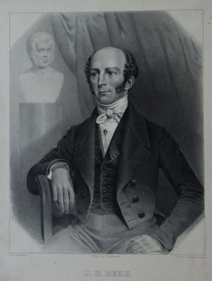 "J. B. Bekk. Vice-Kanzler des Großhl. Badischer Oberhofgerichts, 1842 Präsident der Iiten Kammer". Halbporträt auf einem Stuhl. Karlsruhe, Lithographie von Kauffmann bei Creuzbauer & Hasper, 1845. 29x23,5 cm *Johann Baptist Bekk (* 29. Oktober 1797 in Triberg im Schwarzwald - 22. März 1855 in Bruchsal) war ein badischer Jurist und Politiker. In der Zweiten Kammer der Badischen Ständeversammlung, der er seit 1831 angehörte, gehörte Bekk zu den führenden Vertretern der Opposition. 1842 wurde Bekk zum Präsidenten der Zweiten Kammer der Ständeversammlung gewählt, 1846 Innenminister.