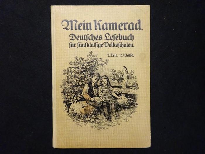 Mein Kamerad. Deutsches Lesebuch ... Ausgabe für fünfklassige Volksschulen in denen jede Klasse einem Schuljahr entspricht. Tl. 1 (2. Klasse) bis Tl. 4 (5. Klasse). 3. Auflage. Prag, Prager Vlgs.-Gesellsch. 1920. "116 S., mit 10 Textabb. u. 6 Vollbild.; 128 S., mit 113 Abb. im Text u. 2 Vollbild.; 146 S., mit Textabb. u. 1 Vollbild; 210 S., mit Abb.; OHLn. m. Deckelzeichn., berieb., Kanten u. Ecken abgewetzt u. etw. bestoß., Schulstemp. auf allen vord. Deckeln, 2 vord. Deckeln vom Buchblock gerissen, Tl. 1 m. loser Titellage, alle Bände m. eingeklebter Zulässigkeitserklärung auf den Titelblättern, papierbed. gebräunt. Dabei: Mein Kamerad. Deutsches Lesebuch für allgemeine österreichische Volksschulen. Ausgabe für fünfklassige Volksschulen in denen jede Klasse einem Schuljahr entspricht. Tl. 1 (2. Klasse). Wien, Tempsky 1912. 123 S., mit 1 Titelbild v. Kaiser Franz Joseph I. sowie 12 Textabb. u. 6 farb. Vollbild., OHLn. m. Deckelill., nur geringf. fleck. u. gebräunt.".