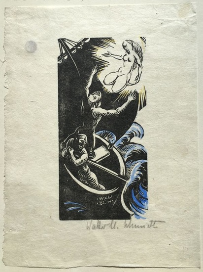 Schiffbruch. Holzschnitt, teilkoloriert. Um 1920. Signiert "Walter-Cl. Schmidt". Im Stock monogrammiert "W.C / SCH". Druck auf breitrandigem faserigem Japan. 14,5 x 7,2 cm. Papier: 20,8 x 15,7 cm. Expressive Szene mit zwei Männern in einem Segelboot auf stürmischer See erscheint Circe. - Das Motiv entstand als Exlibris für Ludwig Färber. - Walter C. Schmidt war ein deutscher Maler, Graphiker und Glasmaler. Als Meisterschüler von Professor Julius Diez studierte er an der Kunstgewerbeschule in München sowie an der Kunstakademie in Düsseldorf. In den nur in sehr kleinen Auflagen erschienenen hochwertigen graphischen Arbeiten aus den 1920er und 30er Jahren beschäftigte er sich überwiegend mit religiösen sowie allegorischen Themen. Er entwarf zahlreiche Exlibris vor allem für namhafte Frankfurter Bürger. Der Künstler scheute stets öffentliche Ausstellungen, daher befinden sich die meisten Werke im Privatbesitz. - In den oberen Ecken lose montiert. Im Außenrandbereich teilweise minimale Knickspuren.