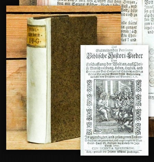 Des Gutmeinenden Petriners Biblische Histori-Lieder : von Erschaffung der Welt an, auf Christi Menschwerdung, Leben, Leyden, und Sterben... angefangen im Pfarr-Gotts-Hauß St. Georgen bey Tolleth, im Jahr Christi 1727. Biblisch Historische Fasten-Andacht I. - XIII. Fasten-Gang. 13 Hefte in 1 Band. Linz, Johann Michael Feichtinger, 1727-, 1740. 8°, circa 14,4 x 8,7 cm., Mit 1 grossen und 13 kleinen Holzschnitten, meist 24 oder 28 Seiten pro Heft. Halb-Pergament d. Zt Seltene Sammlung von hübsch ausgestatteten Liedern, gesammelt von dem Pfarrer in St. Georgen bei Tollet (bzw bei Grieskirchen in Oberösterreich) und Passauer Rat Johann Ferdinand Gessl (1682-1764). Die Reihe wurde bis 1761 auf 30 Nummern fortgeführt. - Nach KVK in Deutschland keine Nachweise, in Österreich nur ein Exemplar. - Nur wenig gebräunt, weisse Vorsätze gelöst, sonst solide und meist sauber, gut erhalten.